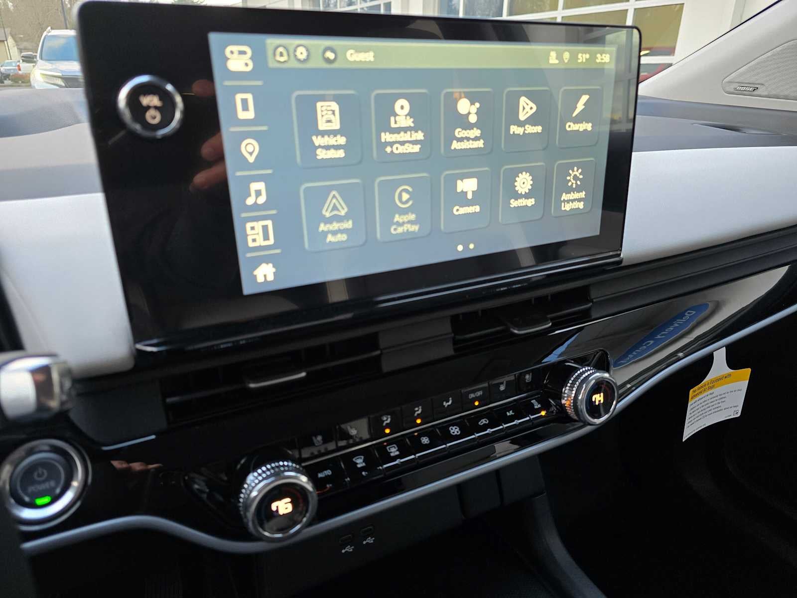 - Radio: Bose Premium Audio System -inc: 12 speakers, 11.3" color touchscreen display, Google built-in, wireless Apple CarPlay and Android Auto compatibility, Bluetooth® streaming audio, USB-C audio interface w/2 charging ports in front console, SiriusXM (All SiriusXM services require a subscription, sold separately by SiriusXM after the trial period, If you decide to continue service, the plan you choose will automatically renew at the then-current rates, Fees and taxes apply, See the SiriusXM customer agreement and privacy policy at www.siriusxm.com for full terms and how to cancel, which includes calling 1-866-635-2349, Available in the 48 contiguous U.S, and D.C, Some services and features are subject to device capabilities and location restrictions, All fees, content and features are subject to change, SiriusXM, Pandora and all related logos are trademarks of Sirius XM Radio Inc, and its respective subsidiaries), Wi-Fi hotspot capability, wireless phone charger and HondaLink connected by OnStar